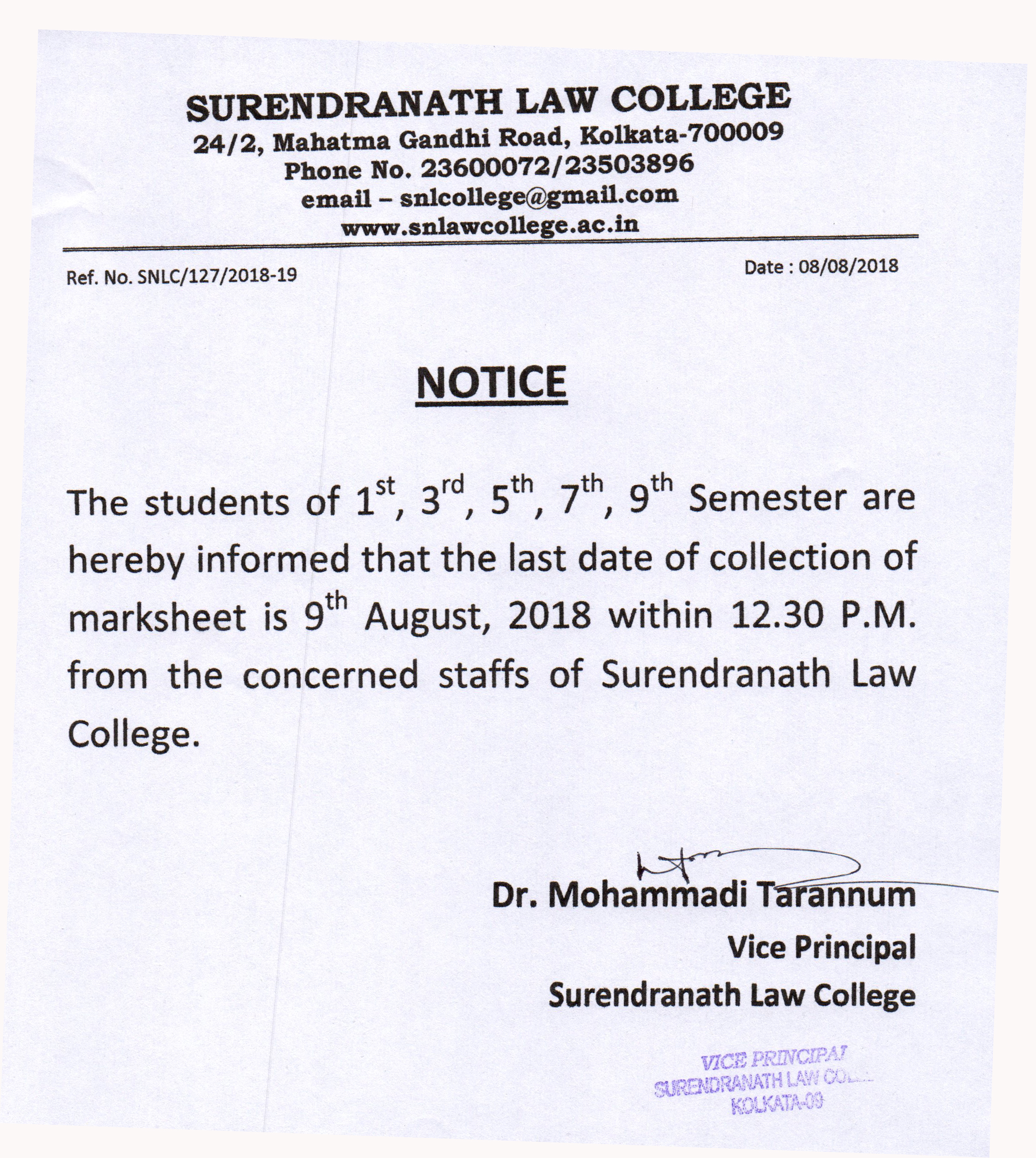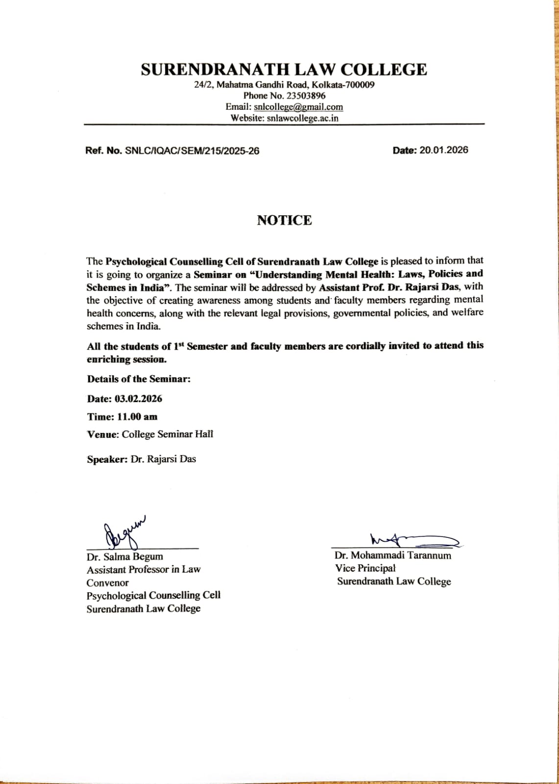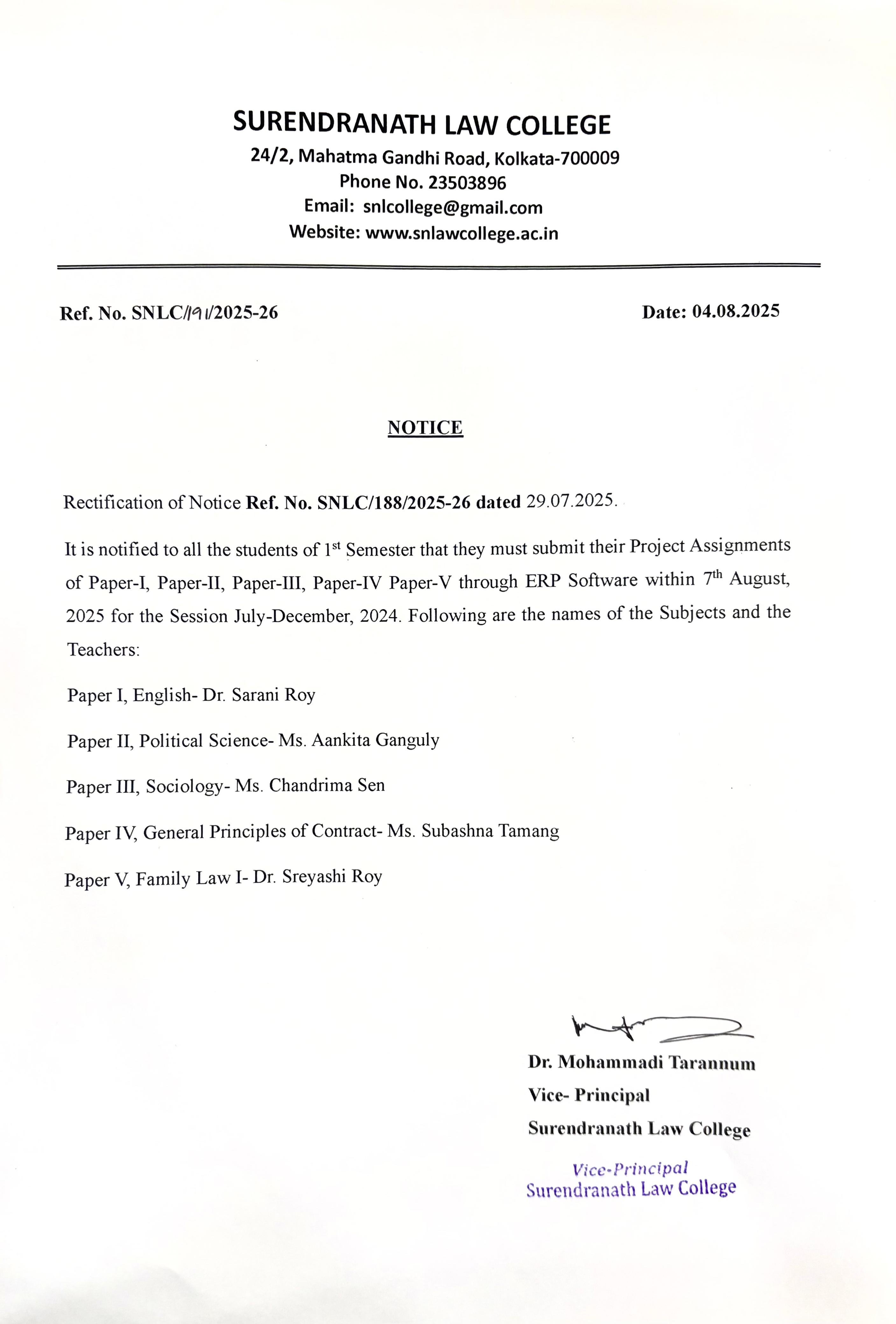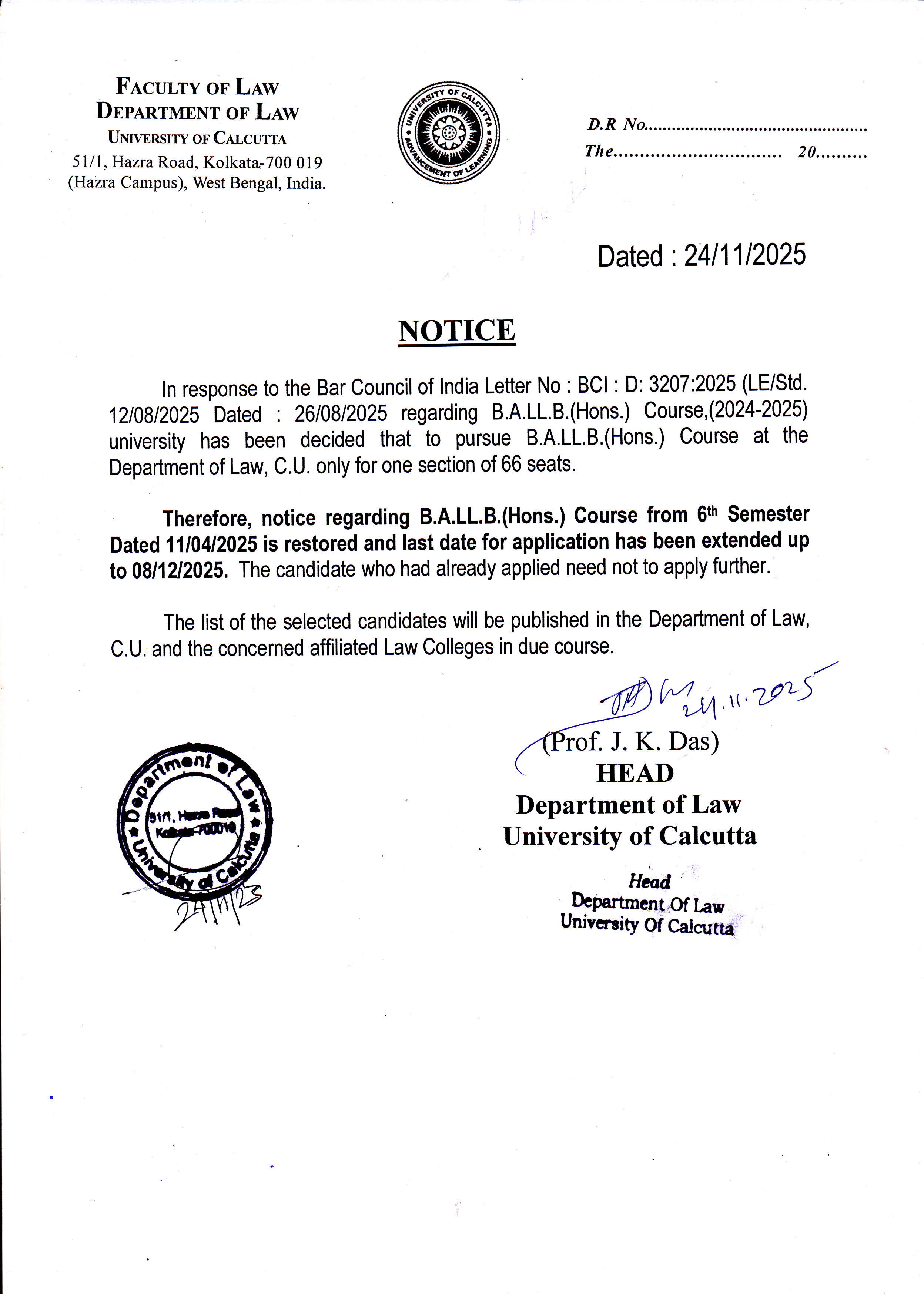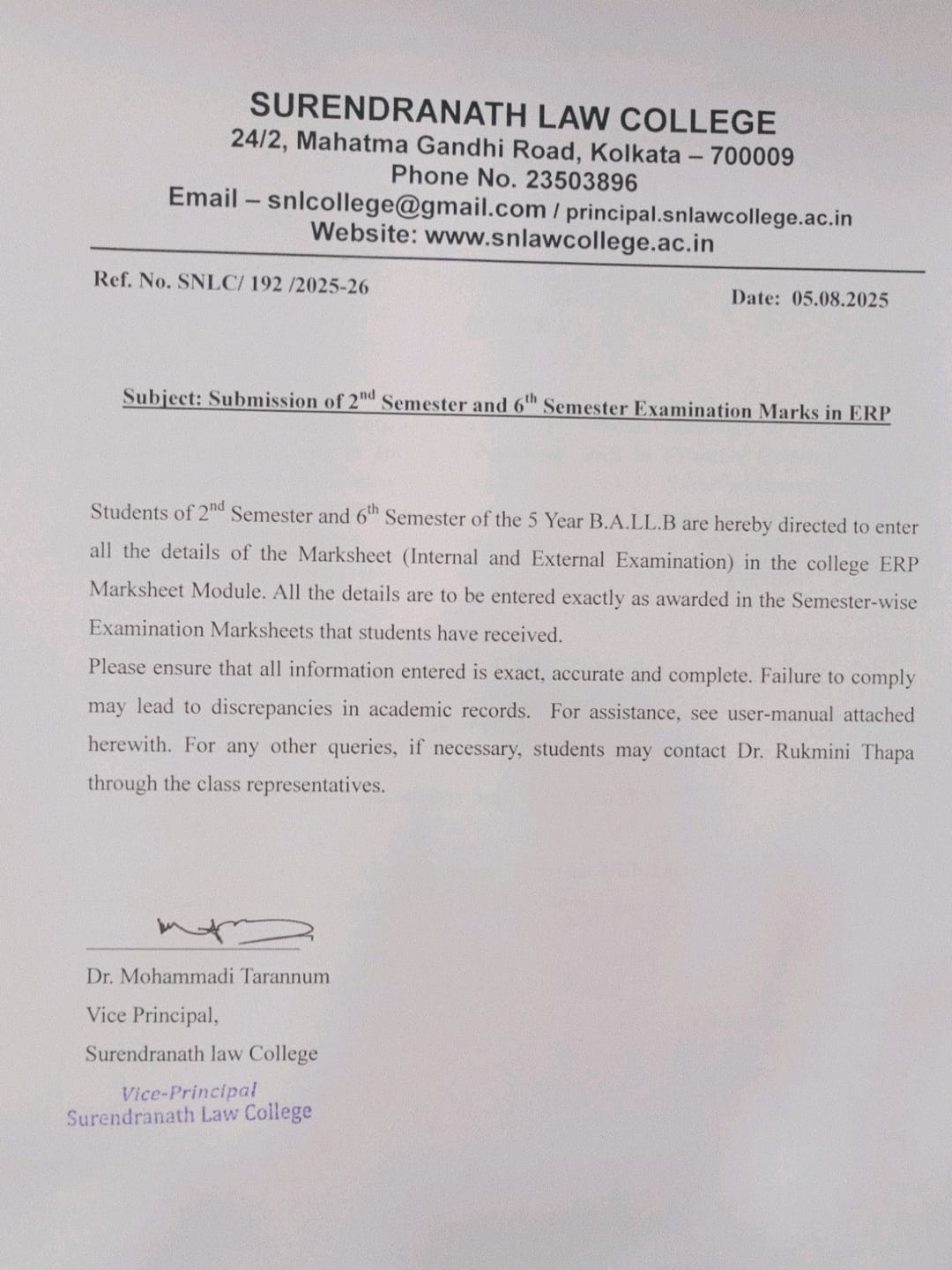 Marksheets of 1 Semester Examination 2024 will be distributed on 12.03.2026 and 13.03.2026 from 9.00 A.M. to 12.00 Noon from college office. The students are hereby directed to contact with Mrs. Ranjita Mukherjee Kundui and the students must bring original Admit Card of that examination