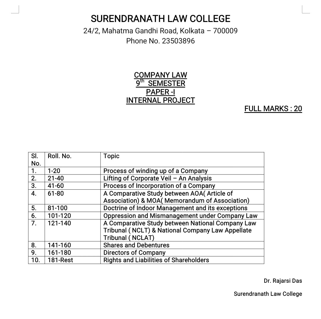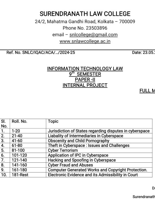 Submission of Internal Assessment Projects – Semester I (B.A. LL.B., Session July–Dec 2025)