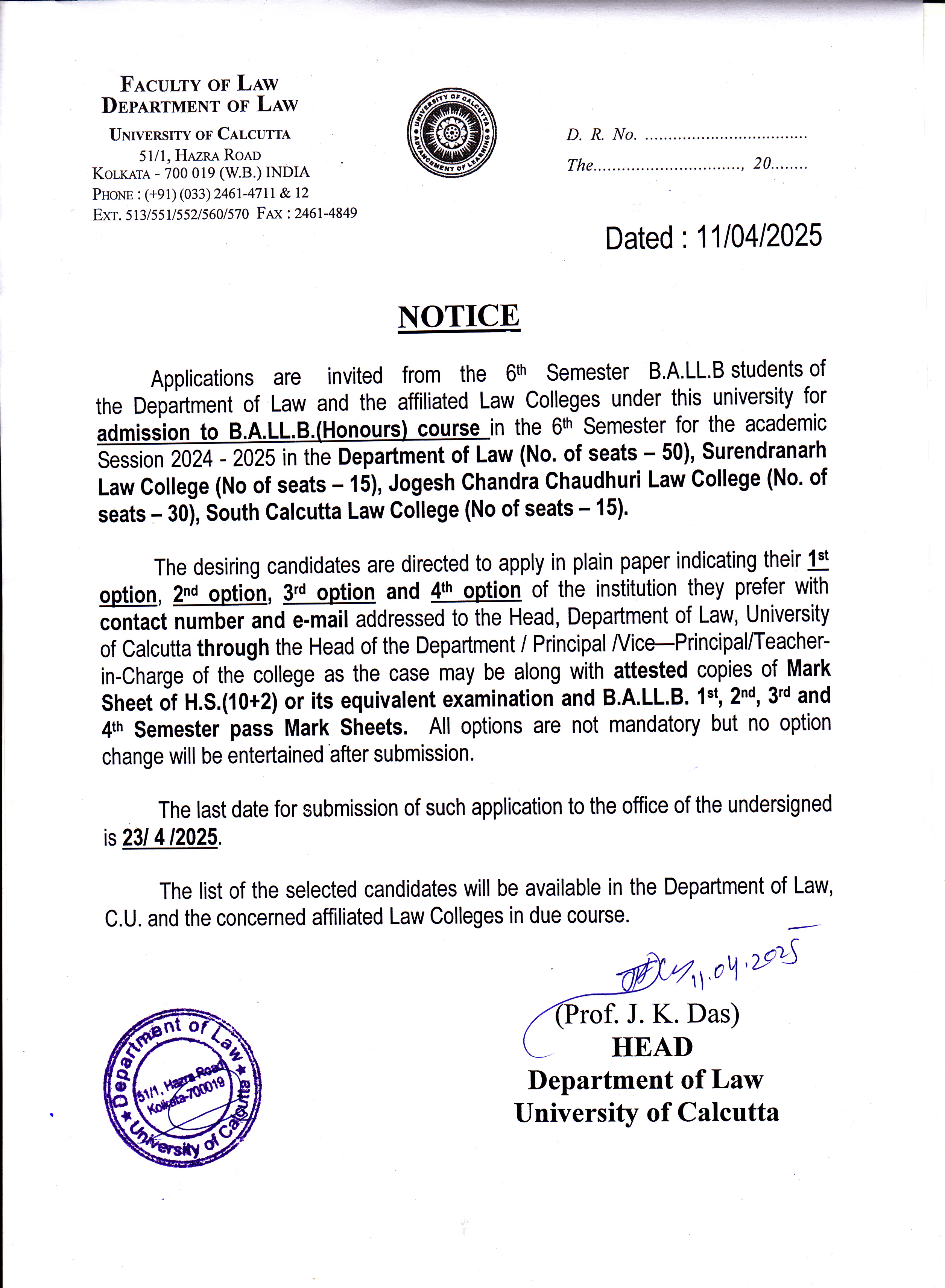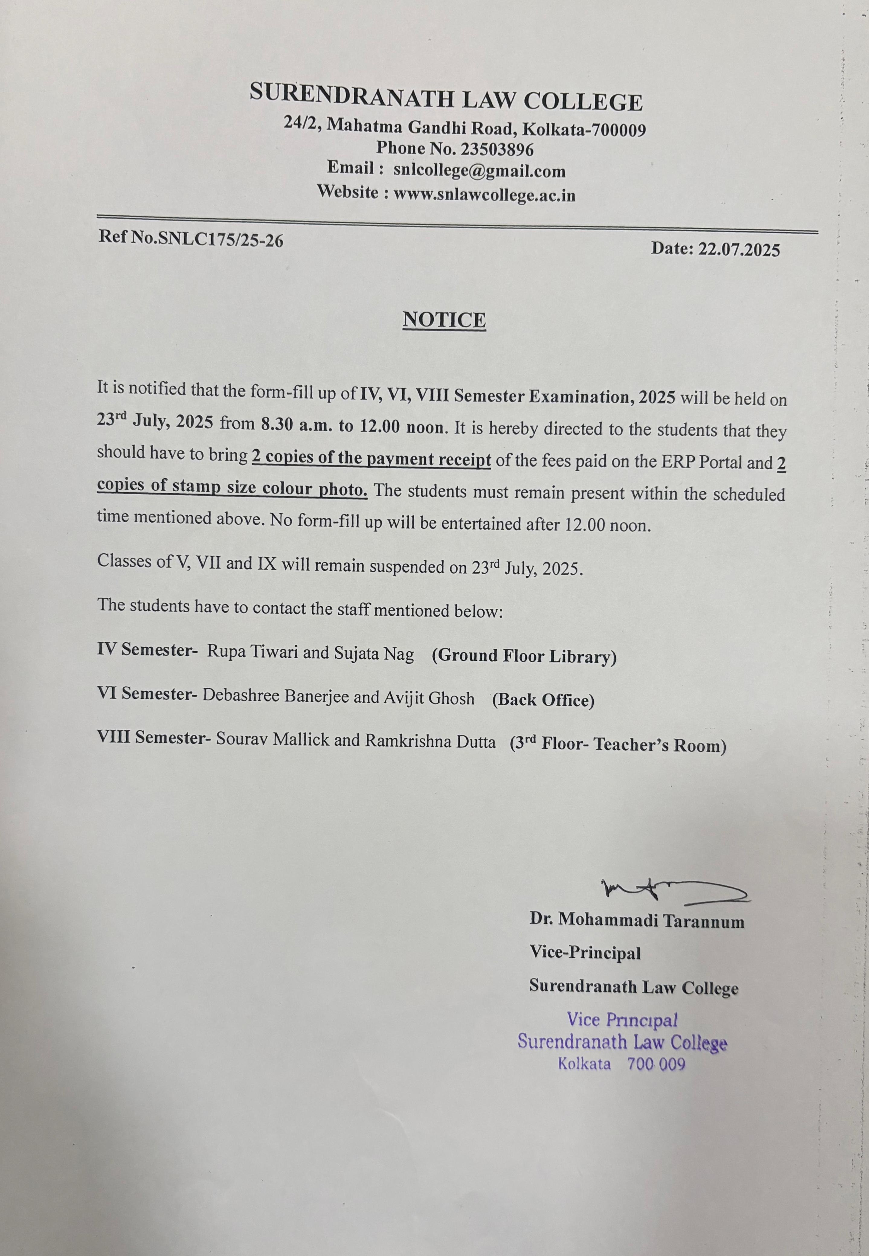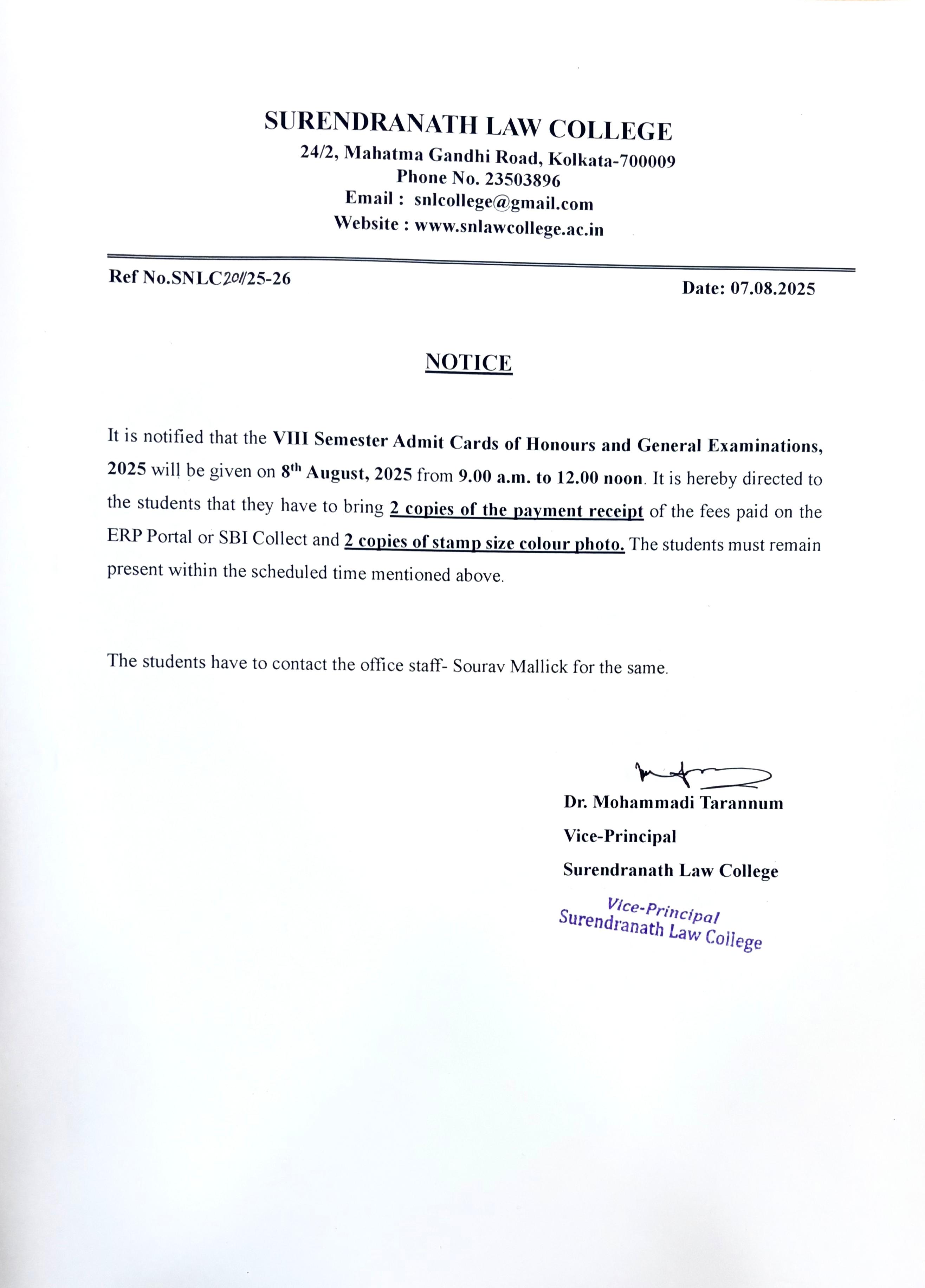Admit Card of 9th Semester Examination 2025 will be distributed on 23.03.2026 and 24.03.2026 from the college office from 9:00 A.M. to 12:00 Noon. The students are hereby directed to submit one colour stamp size photograph at the time of collection of Admit Card and contact with Mr. Avijit Ghosh, dealing staff.