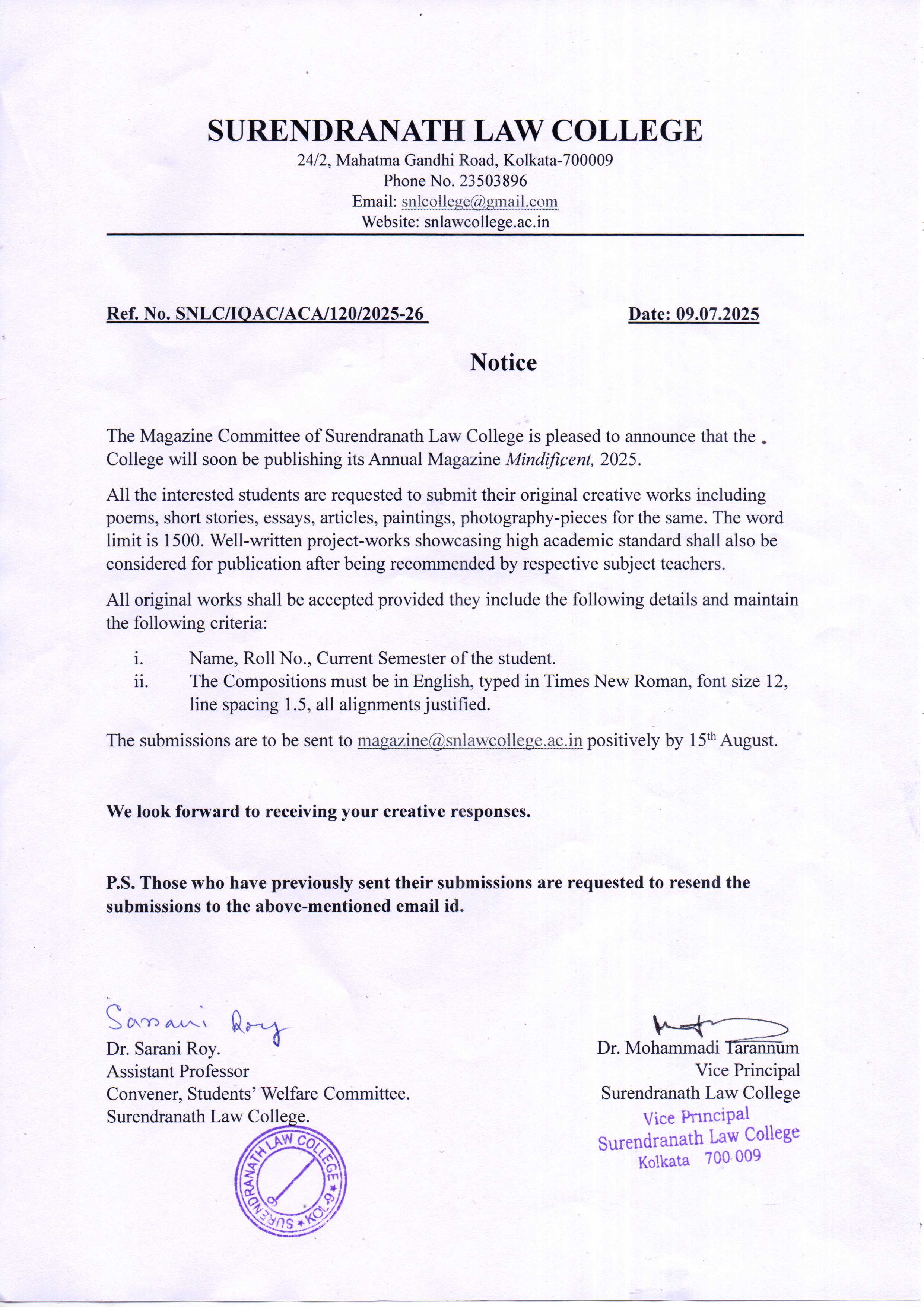 All the students of LL.M. Part-I and Part-I are hereby informed for inviting original contributions in the form of articles, short stories, poems, essays and photographs for the college Magazine Mindificient for the academic session 2025-26