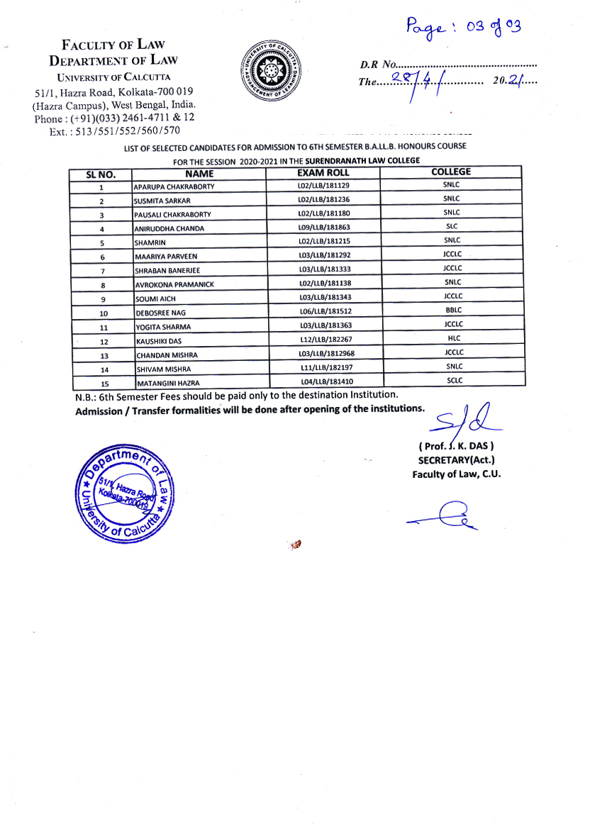 LIST OF SELECTED CANDIDATES FOR ADMISSION TO 6TH SEMESTER B.A. LL.B HONOURS COURSE FOR THE SESSION 2017-18